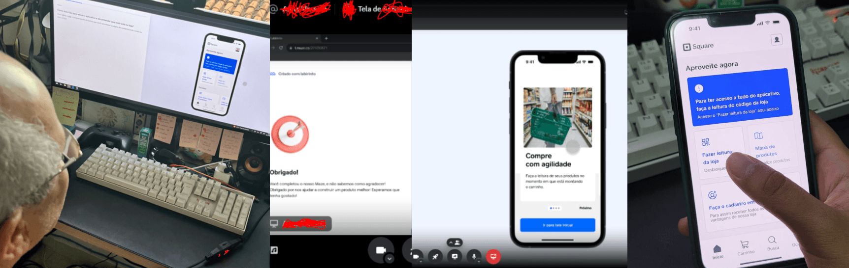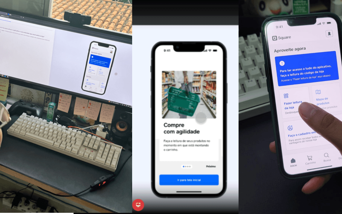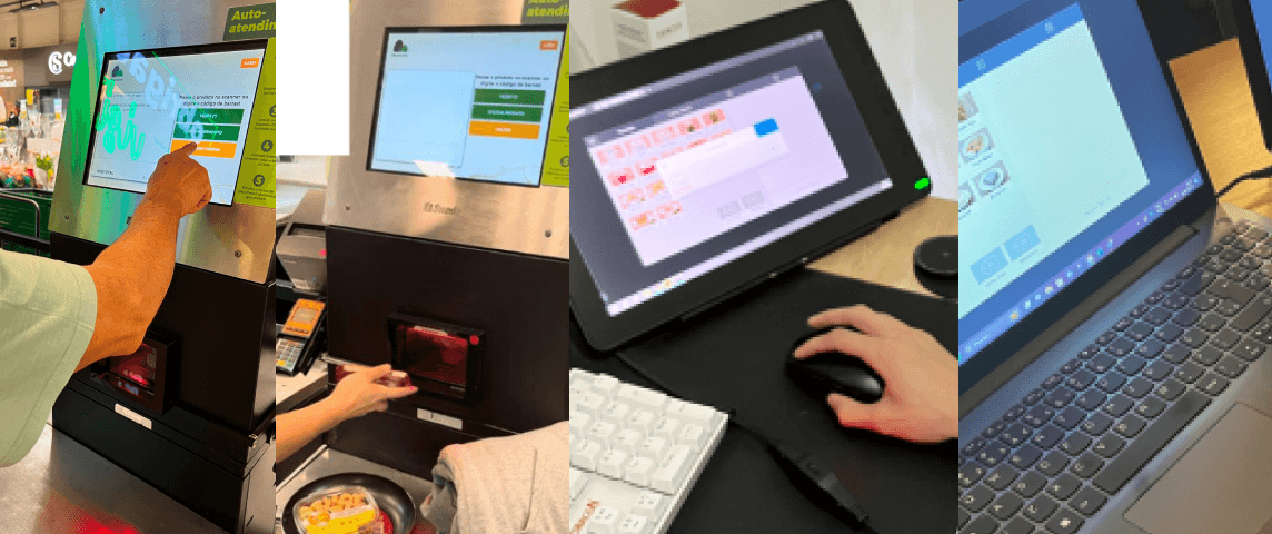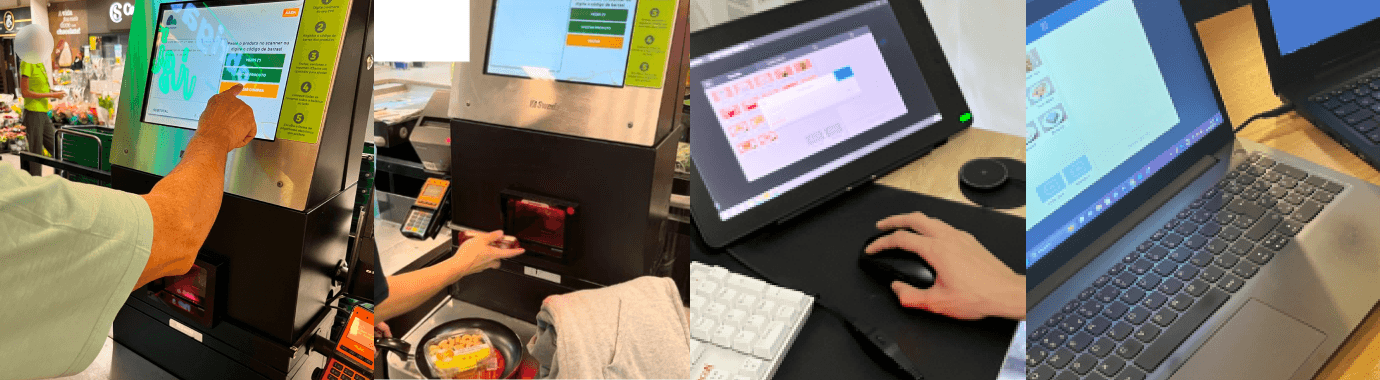 foram com objetivos de mapear os desafios e problemáticas sobre a possibilidade de usos em relação ao processo de navegação e uso dessas interfaces. Onde 2 usuários foram testar caixas no Pão de açúcar e outros 2 ao testar o produto atual da Square.